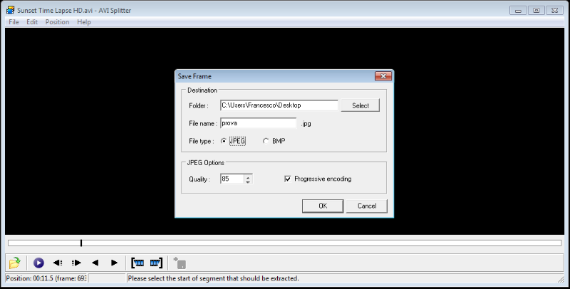 Infine, come in altri programmi di video editing, anche in AVI Split è possibile salvare frame convertendoli in immagini: cliccando su "File > Save Frame" accediamo alla schermata di salvataggio, dov'è possibile scegliere cartella di destinazione del file e sua estensione (file bitmap o JPEG).