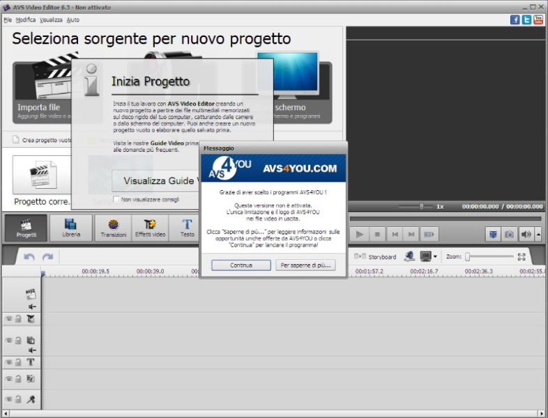 AVS Video Editor può essere utilizzato gratuitamente anche se tutti i video realizzati riporteranno il copyright della software house del programma. Per poter dunque sfruttarlo al 100% è necessario pagare una licenza. Questo dettaglio viene sottolineato al primo avvio quando il programma chiederà se vogliamo attivarlo o se vogliamo continuare ad utilizzarlo con il limite del logo della software house su ogni nostro video.