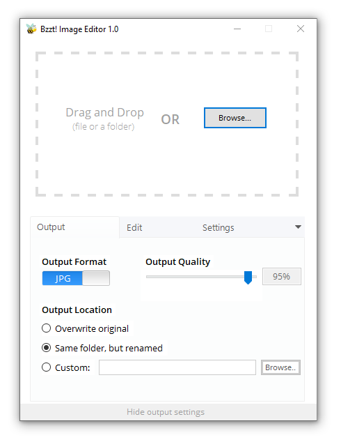 Bzzt! Image Editor è un semplice ma efficace editor per immagini con cui è possibile effettuare alcuni semplice ritocchi. Nello specifico, il programma consente di ruotare, comprimere, ridimensionare e convertire l'immagine all'interno di un'interfaccia utente molto semplice ed intuitiva. Tutto quello che gli utenti saranno chiamati a fare è aprire il programma e importare l'immagine da modificare con un semplice drag and drop. Successivamente, alla base del programma troveranno tutte le opzioni di editing disponibili.