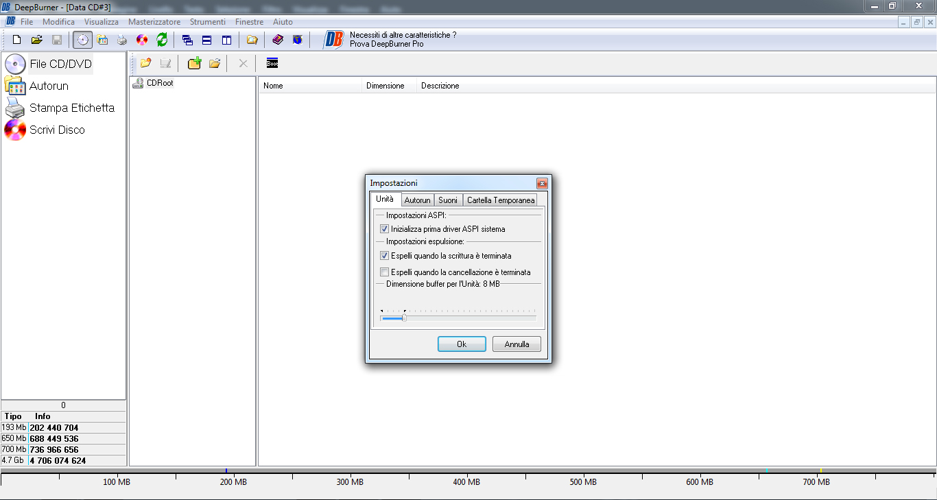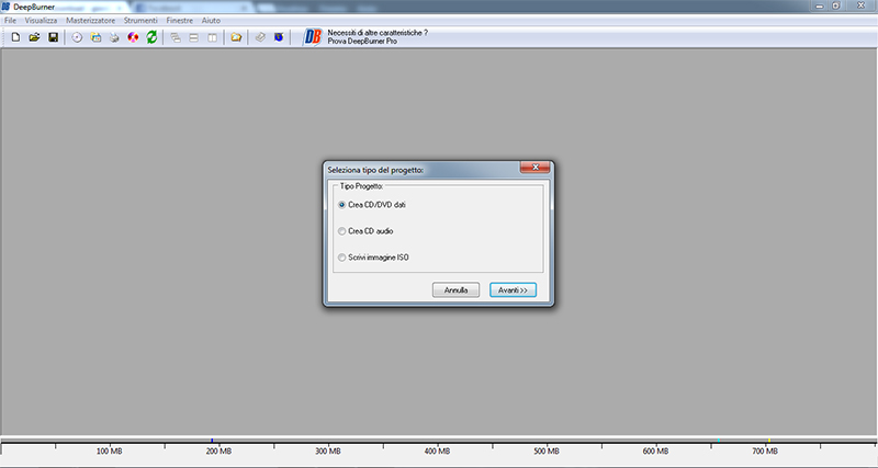 L'immediatezza è una delle prime caratteristiche che distingue Deep Burner: una volta avviato il software propone un'interfaccia grafica standard, che analizzeremo a breve, e un popup che ci chiede se vogliamo creare un CD/DVD dati, un CD Audio o se scrivere un'immagine ISO.