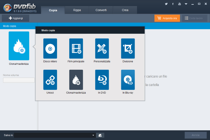 La modalità Copia, consente di effettuare una copia 1:1 di un disco inserito nel vostro lettore. E’ possibile scegliere diverse modalità come “Disco Intero”, “Film principale”, “Personalizzata”, ecc.