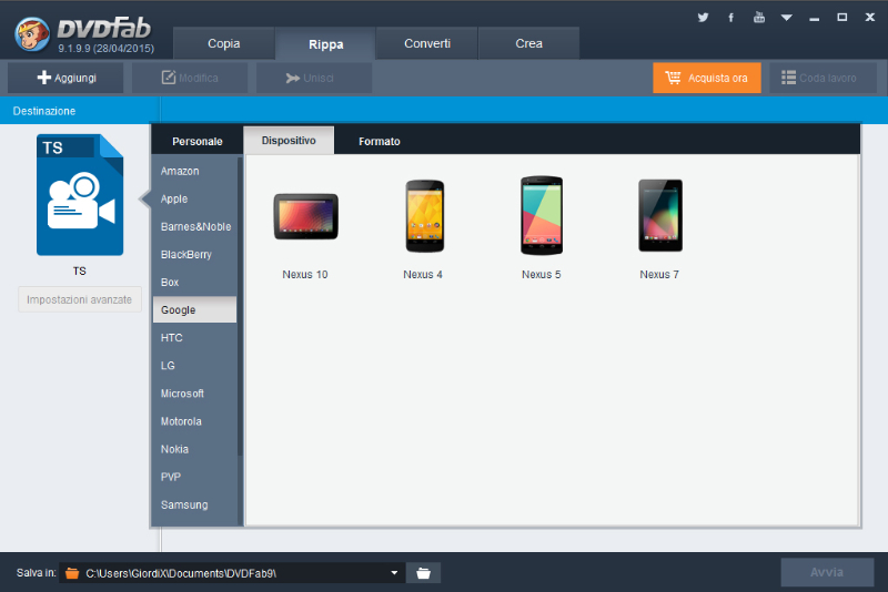 Tramite la sezione “Rippa” è possibile, appunto, rippare un disco in diversi formati; oltre ad un profilo personale da creare e personalizzare, sono presenti i formati e i dispositivi più comuni.