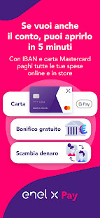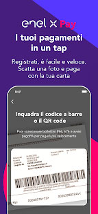 Enel X Pay è una pratica versatile app realizzata per facilitare pagamenti di diversa tipologia. È disponibile gratuitamente per smartphone e tablet Android/iOS e si pone in evidenza per l'immediatezza della sua interfaccia utente. La prima operazione da compiere è quella di effettuare la registrazione attivando un profilo personale legato ad una carta di credito Mastercard o ad un conto corrente (IBAN). La facilità d'uso di esplicita con la scansione di un codice a barre o QR per effettuare un pagamento.