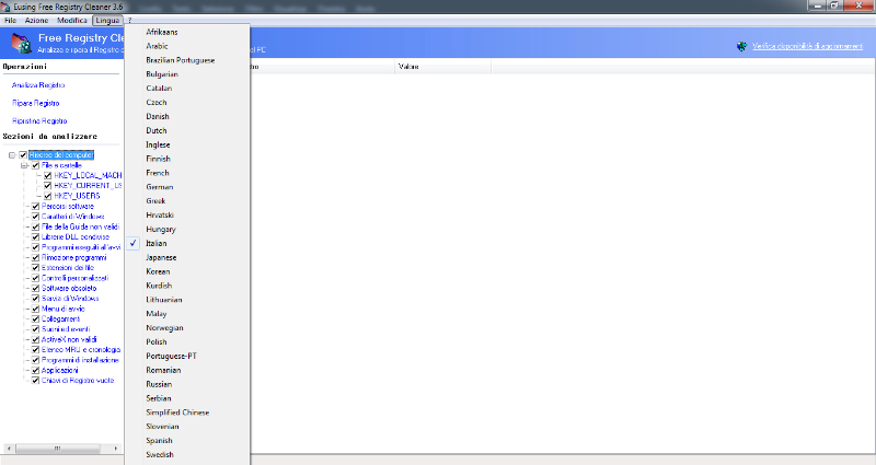 Un intero menù è dedicato alla lingua: il programma supporta più di 30 lingue ed è presente anche l’italiano. Le attività principali si avviano tramite tre pulsanti posti in alto a sinistra, chiamati Analizza Registro, Ripara Registro e Ripristina Registro.