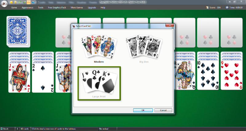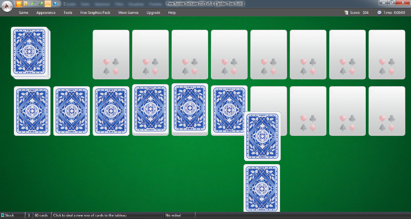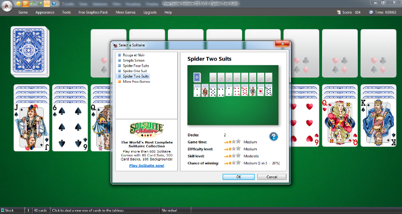 Nonostante le dimensioni esigue del file di installazione, già dal primo avvio si ha la sensazione che il gioco sia curato nell’aspetto. L’interfacci a tutto schermo offre il classico tavolo verde da gioco e una schermata vi consente di scegliere fra 5 modalità di gioco: Rouge et Noir, Simple Simon, Spider Four Suits, Spider One Suit e Spider Two Suits.