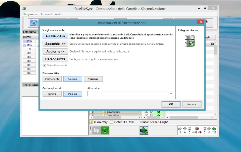 A questo punto dovremo cliccare su "Compara" e FreeFileSync verificherà tutte le differenze tra le due directory segnalando cosa dovrà essere sincronizzato. Il successivo passo da effettuare sarà quello di avviare la sincronizzazione cliccando su "Sincronizza". Prima però, è possibile anche scegliere che tipo di sincronizzazione effettuare.