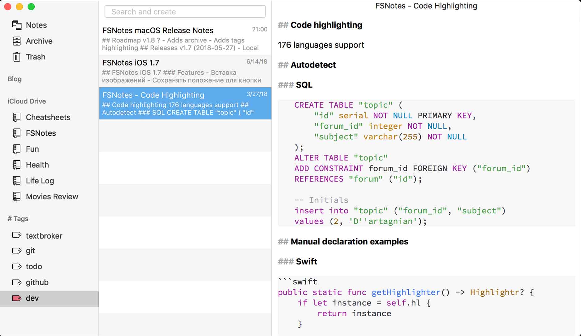 FSNotes è installabile nel sistema operativo desktop di Apple a partire dall'edizione 10.12. Il mouse passa in secondo piano con questo software, in quanto ogni comando è associabile ad una combinazione specifica di tasti. Ciò contribuisce a rendere ancora più immediato lo svolgimento delle attività. Le funzionalità di formattazione consentono di generare testi compatibili con il formato RTF e si riescono così a gestire le note anche all'interno di applicativi di terze parti.