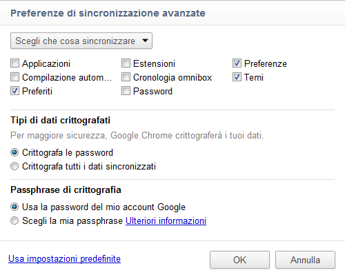 Tra le preferenze di sincronizzazione avanzate si può scegliere con comode caselle di controllo quali attività gestire, legate ad applicazioni, estensioni, preferenze, compilazione automatica, temi, preferiti, password e cronologia omnibox. Proprio in relazione alla gestione della cronologia, può servire sapere che la si può cancellare in automatico.