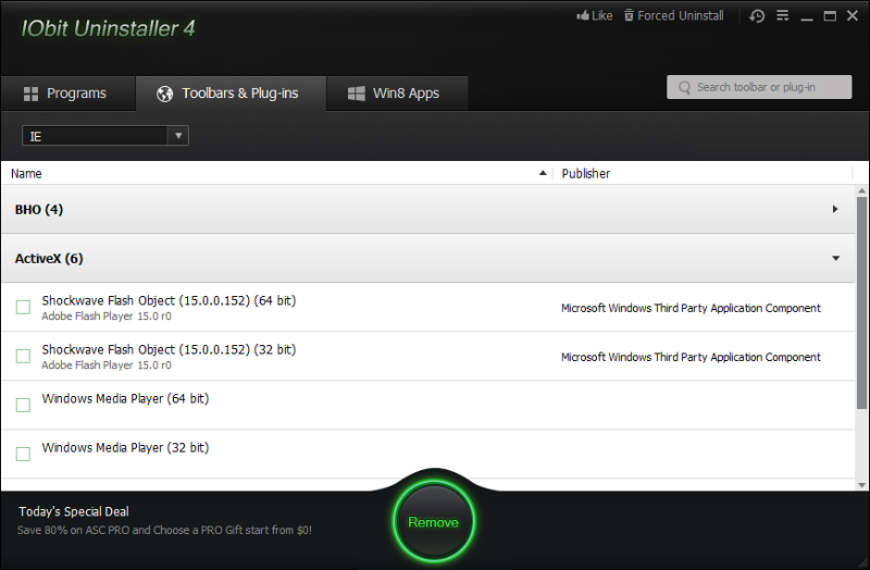 Al primo avvio del programma, IObit Uninstaller effettua una veloce scansione di tutti i programmi installati che saranno suddivisi in 3 categorie: “Programmi”, “Toolbar e Plug-In” e “Win 8 App”. IObit Uninstaller permette infatti la disinstallazione anche di tutte le più fastidiose toolbar che spesso vengono installate a nostra insaputa ed elimina pure le Applicazioni Modern, quelle pensate esplicitamente per Windows 8/8.1.