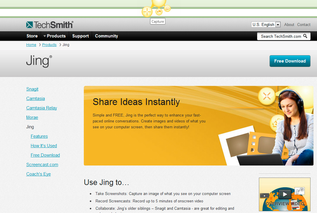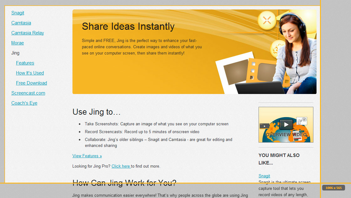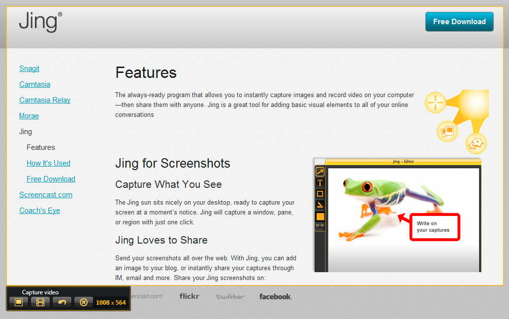 Jing è uno strumento dedicato a chi desidera catturare screenshot o filmati del proprio desktop. Sviluppato dalla software house TechSmith, già responsabile di progetti come Camtasia Studio e SnagIt, il programma mette a disposizione dell'utente un'interfaccia piuttosto semplice e intuitiva, attraverso la quale salvare sul disco fisso un'immagine statica oppure un video delle operazioni eseguite sul computer. Questo può tornare utile per le ragioni più disparate: dallo studente che vuole inviare appunti o la risoluzione di un problema a un compagno, fino al videogiocatore che desidera mostrare su Internet lo spezzone di una partita.