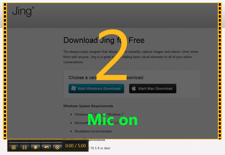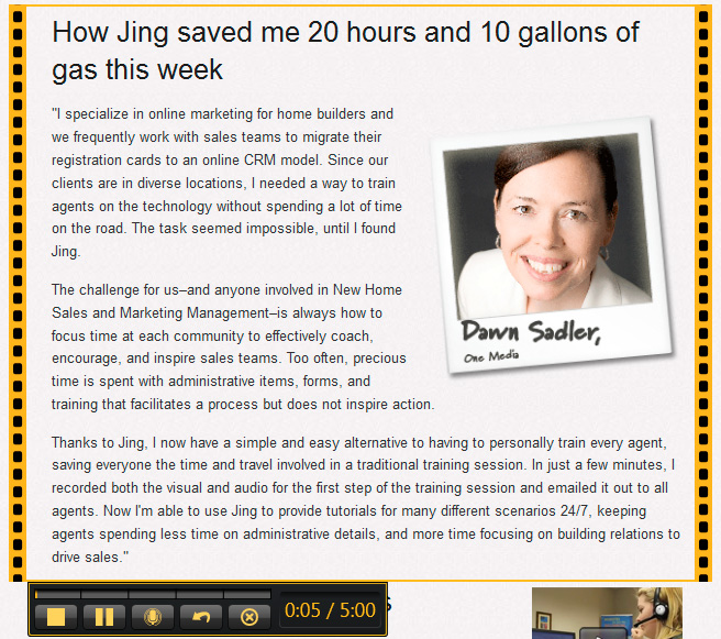 La seconda opzione Capture Video (Cattura un video) serve invece per effettuare una vera e propria registrazione di quanto avviene sul desktop. Selezionandola parte un conto alla rovescia, al termine del quale tutto ciò che si trova all'interno dell'area definita viene filmato. È possibile aggiungere una traccia audio al risultato, registrandola in tempo reale mediante un microfono. Con un click su Stop si ferma l'operazione e viene aperta un'anteprima di quanto ottenuto, da salvare ancora una volta con un click sul comando Save (Salva). Va specificato che Jing supporta esclusivamente il formato .SWF e una lunghezza massima dei video pari a cinque minuti.