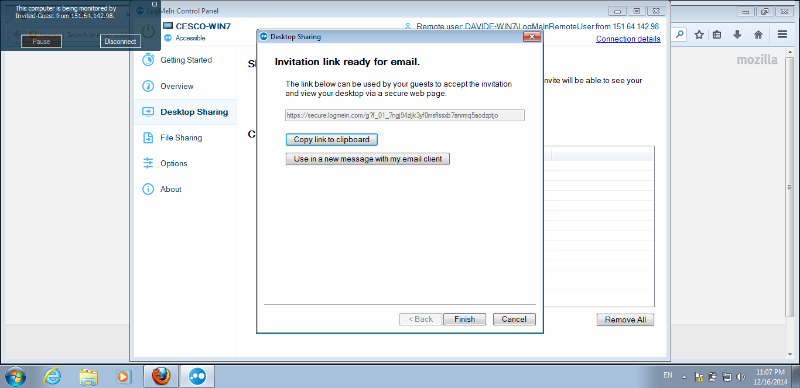 Fornito il link, l'utente potrà inserirlo nel proprio browser e aprire una connessione col PC dove è stato installato LogMeIn, senza dover installare nessun programma ma solo tramite browser. Sul PC chiamato da Remoto verrà visualizzata una piccola finestra con l'indirizzo IP di chi prova ad accedere al PC e due pulsanti per consentire o negare l'accesso. Una volta accettato, bisogna scegliere se consentire all'utente di utilizzare da remoto il nostro PC o se dovrà solo limitarsi a vedere le finestre da noi visualizzate.