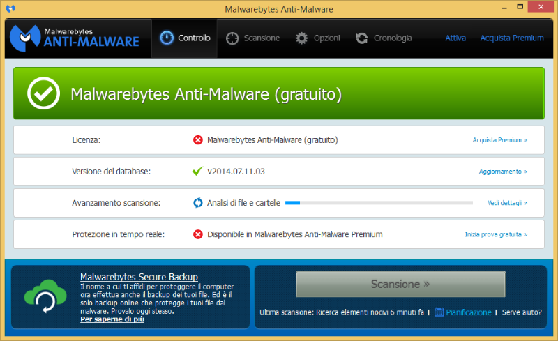 Malwarebytes Anti-Malware Free è uno strumento in grado di rilevare ed eliminare definitivamente i malware presenti all'interno del computer. Il software è in grado di liberare il sistema dai virus e dai malware più conosciuti. Il programma inoltre proteggere il computer in tempo reale (nella versione a pagamento), in modo che nessun altra minaccia possa infettare il PC e creare problemi di qualsiasi genere.