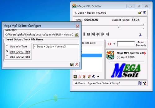 Mega MP3 Splitter permette di effettuare un taglio su una traccia audio mp3 in pochi secondi senza dover ricodificare il file e salvando l'output su altrettanti file mp3 separati: basta selezionare il file mp3 che si desidera tagliare, selezionare i punti dove si vuole dividere il file audio (inizio, fine e punti intermedi), infine avviare il processo. I file che si ottengono saranno rinominati automaticamente in base allo schema scelto dall'utente o in base alle meta-informazioni contenute nell'etichetta dell'mp3.