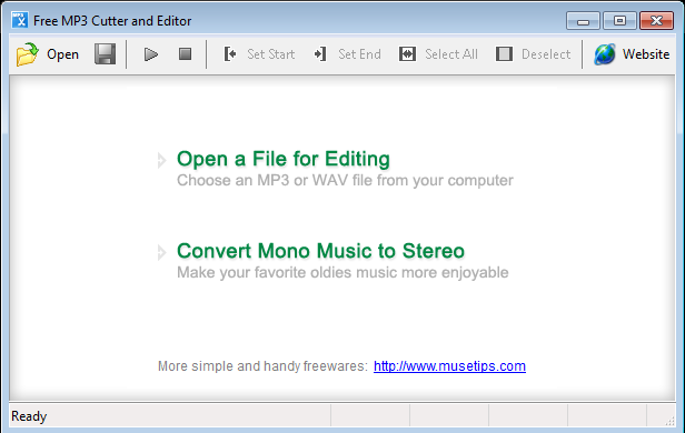 La finestra ci presenta una barra degli strumenti in alto e una zona centrale con due possibili funzioni principali: l'editing di un file MP3 o WAV prelevandolo direttamente dal nostro disco fisso e la conversione di un file audio mono in stereo.