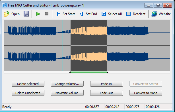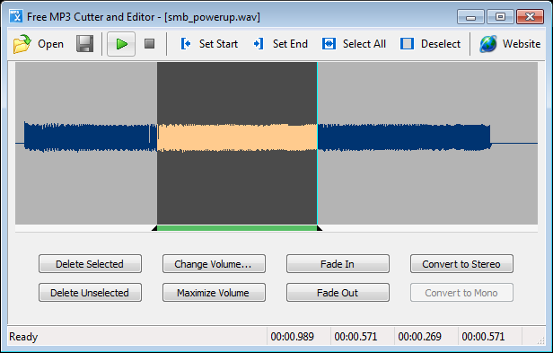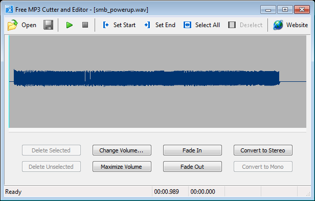 Con il comando "open" di Free MP3 Cutter and Editor possiamo aprire un file mp3 o wav da modificare e entrare in una nuova sezione del programma con una serie di comandi. Tale sezione di permetterà non solo di tagliare l'audio come desideriamo ma anche di modificarne il suono, proprio come un programma di editing professionale.