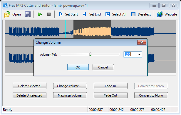 Infine, come in tutti i programmi di editing audio mp3 e wav, anche Free MP3 Cutter and Editor mette a disposizione degli utenti uno strumento di regolazione del volume del suono. Selezioniamo una zona del file e clicchiamo sul tasto "change volume": con una barra potremo decidere di che percentuale aumentare o ridurre il volume del suono. Se invece desideriamo massimizzare il volume del suono con Free MP3 Cutter and Editor possiamo premere il pulsante "maximize volume" e automaticamente il volume verrà impostato al massimo.