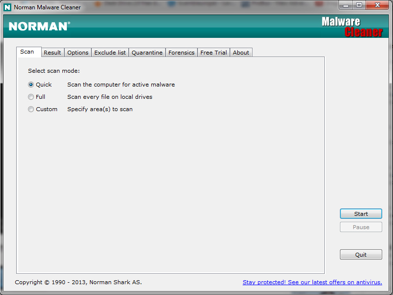 Basta dare una rapido sguardo ai tab per farsi un'idea delle operazioni disponibili: in ordine troviamo Scan, Result, Options, Exclude List, Quarantine, Forensics e due schermate funzionali, che mostrano i dettagli sulla versione del software e la pubblicità di Norman Antivirus & Antispyware, il prodotto commerciale proposto da Norman.