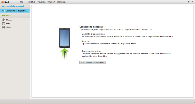 Conclusa la copia dei file possiamo avviare il programma il primo passo da fare è quello di associare un dispositivo. Come possiamo immaginare questa è un'operazione molto importante e Samsung offre una procedura guidata per associare il vostro dispositivo al computer, installando i driver corretti.