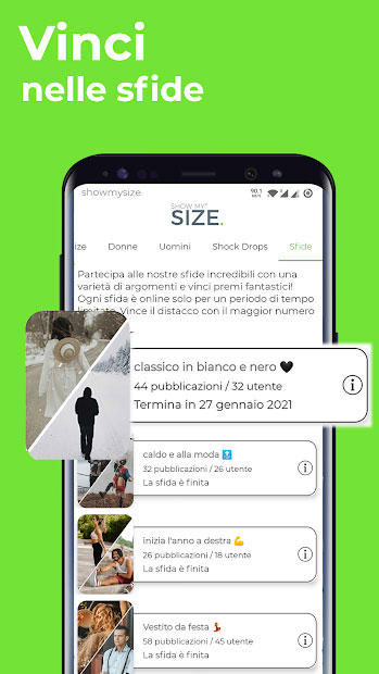 Show my Size - Vendi e compra divide gli articoli in pratiche categorie, dove si possono individuare gli elementi anche per marca. La peculiarità di questo software è rendere disponibili sfide nelle quali i partecipanti devono pubblicare il proprio outfit su temi specifici e chi le vince ha diritto a crediti. Scarpe, capi di abbigliamento ed accessori vengono pubblicati con foto e schede esplicative, così da poterli valutare in modo adeguato prima di procedere con un eventuale acquisto.