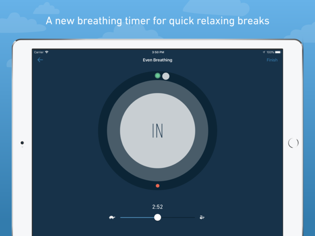 L'app impone che durante l'arco della giornata vi prendiate alcuni minuti da dedicare a voi stessi, per ritrovare la calma e liberarvi dall'eventuale stress accumulato, sia esso a causa del lavoro o di qualche imprevisto, con l'obiettivo di riuscire a far divenire un'abitudine tali operazioni e portarvi ad avere dei benefici anche a lungo termine.