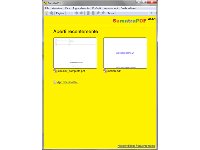 Dopo aver aperto alcuni file, non necessariamente PDF visto che, come già citato, il software è compatibile con i formati DjVu, EPUB, XPS, CHM, CBR, CBZ e MOBI, quando riaprirete Sumatra PDF o quando vi posizionerete nella schermata principale, il software vi mostrerà i documenti aperti recentemente.