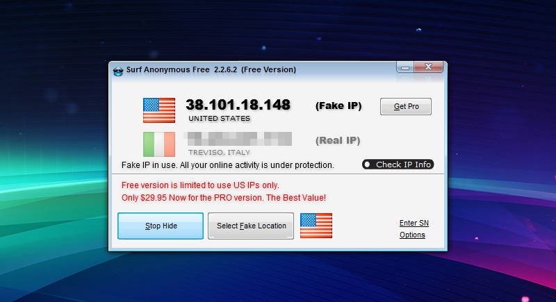 Come detto, l'obiettivo di software come Surf Anonymous Free è quello di consentire a chi naviga l'anonimato in Rete. Per farlo ci si affida a proxy sparsi in tutto il mondo, anche se nella versione gratuita è possibile usare solo quelli degli Stati Uniti. Sotto questo aspetto il programma va premiato per la sua estrema semplicità: basta infatti un solo click su "Hide IP" ed il gioco è fatto, cosa che non avviene con molte alternative che spesso richiedono un processo di configurazione laborioso e non alla portata di tutti.