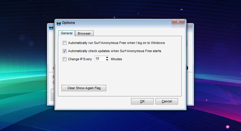 Tra le opzioni della scheda General sono presenti tre voci: "Automatically run Surf Anonymous Free when I log into Windows" (apri il software ad ogni avvio), "Automatically check updates when Surf Anonymous Free starts" (controlla la presenza di aggiornamenti all'avvio del programma) e "Change IP every ** minutes" (per cambiare IP a intervalli regolari). In Browsers, invece, è possibile abilitare o disabilitare l'integrazione con Internet Explorer Firefox Opera