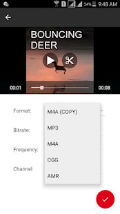 Video To Audio Converter propone all'avvio due semplici pulsanti, uno per convertire file video in audio e l'altro per ritagliare clip video. Supporta i formati più comuni, come mp4, webm, mkv, wmv, avi, flv, mov, mp3, aac, m4a, ogg, wma, ac3 ed amr. L'editazione concerne anche bitrate (128 kbs/s, 160 kb/s, 192 kb/s, 256 kb/s, 320 kb/s...), frequenza (8000 Hz, 16000 Hz, 22050 Hz, 44100 Hz o 48000 Hz) e canale (mono o stereo). L'app è in grado di operare in background, pertanto si può continuare ad utilizzare il device durante il processo di conversione.