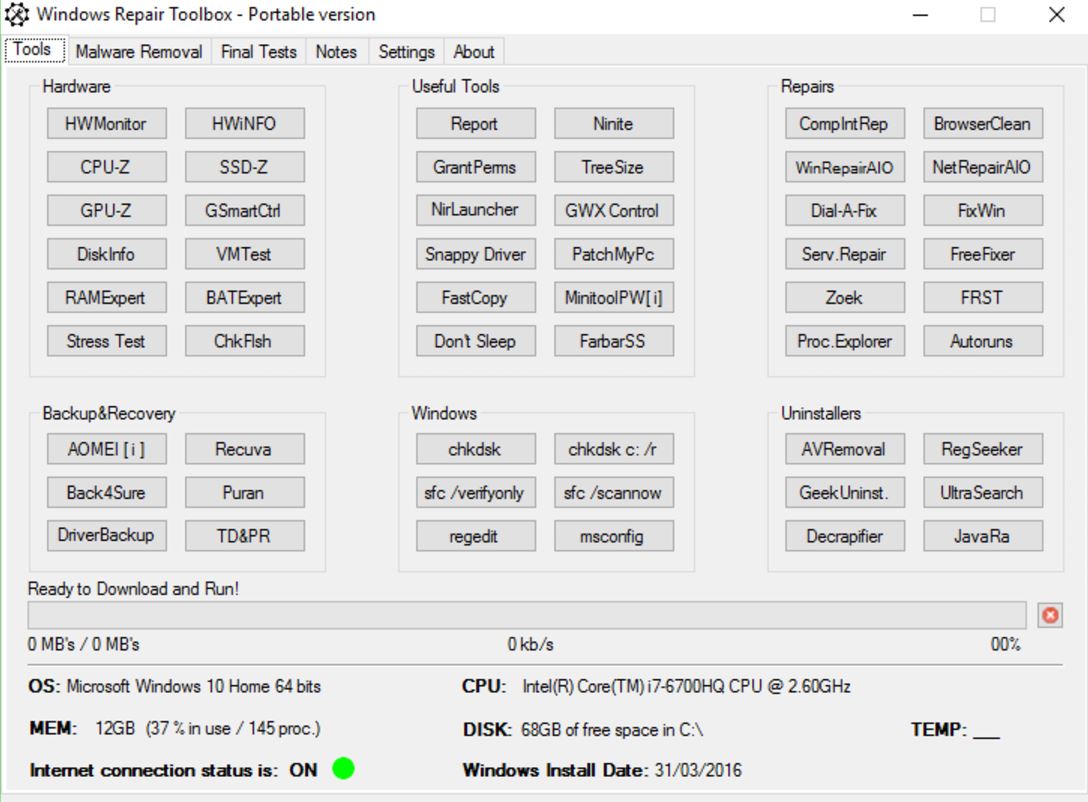 Windows Repair Toolbox Portable offre un'interfaccia molto chiara dove tutti gli strumenti di manutenzione sono racchiusi in comode categorie in maniera che gli utenti possano individuarli con facilità. Anche se facile da utilizzare, Windows Repair Toolbox Portable deve essere utilizzato con responsabilità perché modificare le impostazioni di un computer può avere sempre delle conseguenze. Windows Repair Toolbox Portable è un programma assolutamente gratuito.
