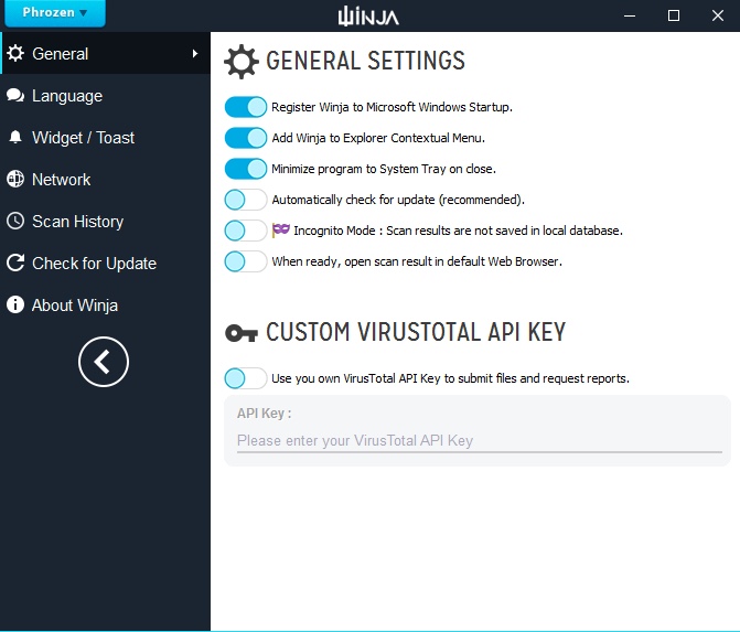 WINJA è uno speciale antivirus on demand che permette di verificare la sicurezza di file e cartelle. Non è da intendersi come un classico antivirus con protezione in tempo reale ma come uno strumento che permette di verificare l'affidabilità di un file o di un programma. Questo applicativo, infatti, invia i file da verificare ai server di VirusTotal che ne verificheranno l'affidabilità e la sicurezza. In questo modo gli utenti potranno sempre sapere se il file ricevuto per posta o il programma che stanno per installare sono davvero sicuri e privi di rischi.