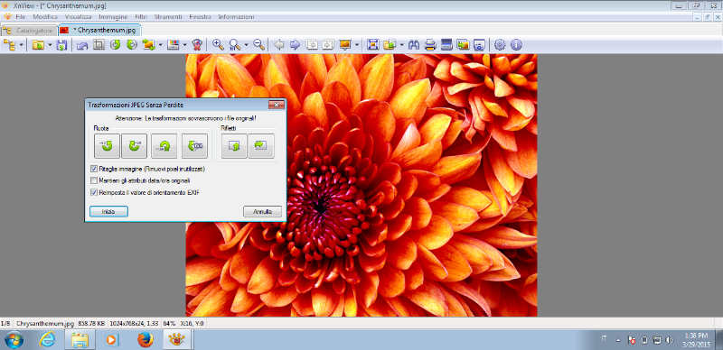 Fermandoci col mouse su ogni pulsante, otterremo la sua descrizione: taglio, ruota in senso anti-orario e in senso orario, trasformazioni JPEG senza perdita, modifica di contrasto, saturazione e luminosità, rimuovi occhi rossi, pulsanti di zoom e i pulsanti di navigazione per le immagini in cartella - molto comodi se si stanno modificando più immagini di una stessa cartella.